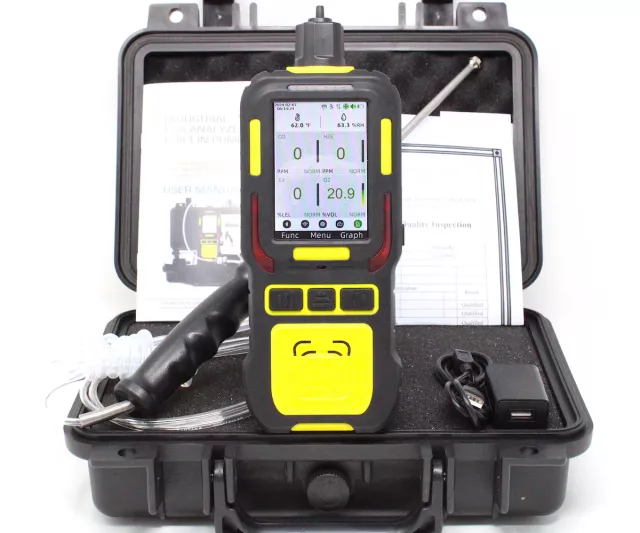 Included: 4 Gas Data Logger Analyzer, English manual, USB charging cable, charger, analyzer case, 4ft telescopic stainless probe, tubing, and USA NIST calibration certificate.